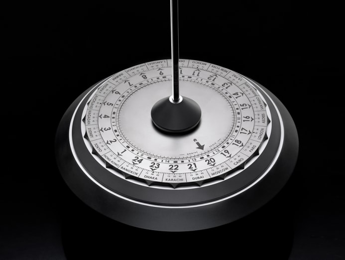 The fourth dimension is located at the base of the stem, where the hours and minutes tin be read off two rotating discs. An encircling cities ring can as well exist adjusted to set the world time. The entire thing stands at a height of 29cm and volition run for two weeks before information technology requires transmission winding via a key. Limited to seven pieces.