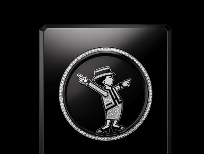 Derisive yet somehow nevertheless chic, Chanel's new tabletop accessory puts its founding figure squarely in the spotlight, using her artillery as hour and minute hands and they make their rounds along a dial ringed with 166 diamonds.